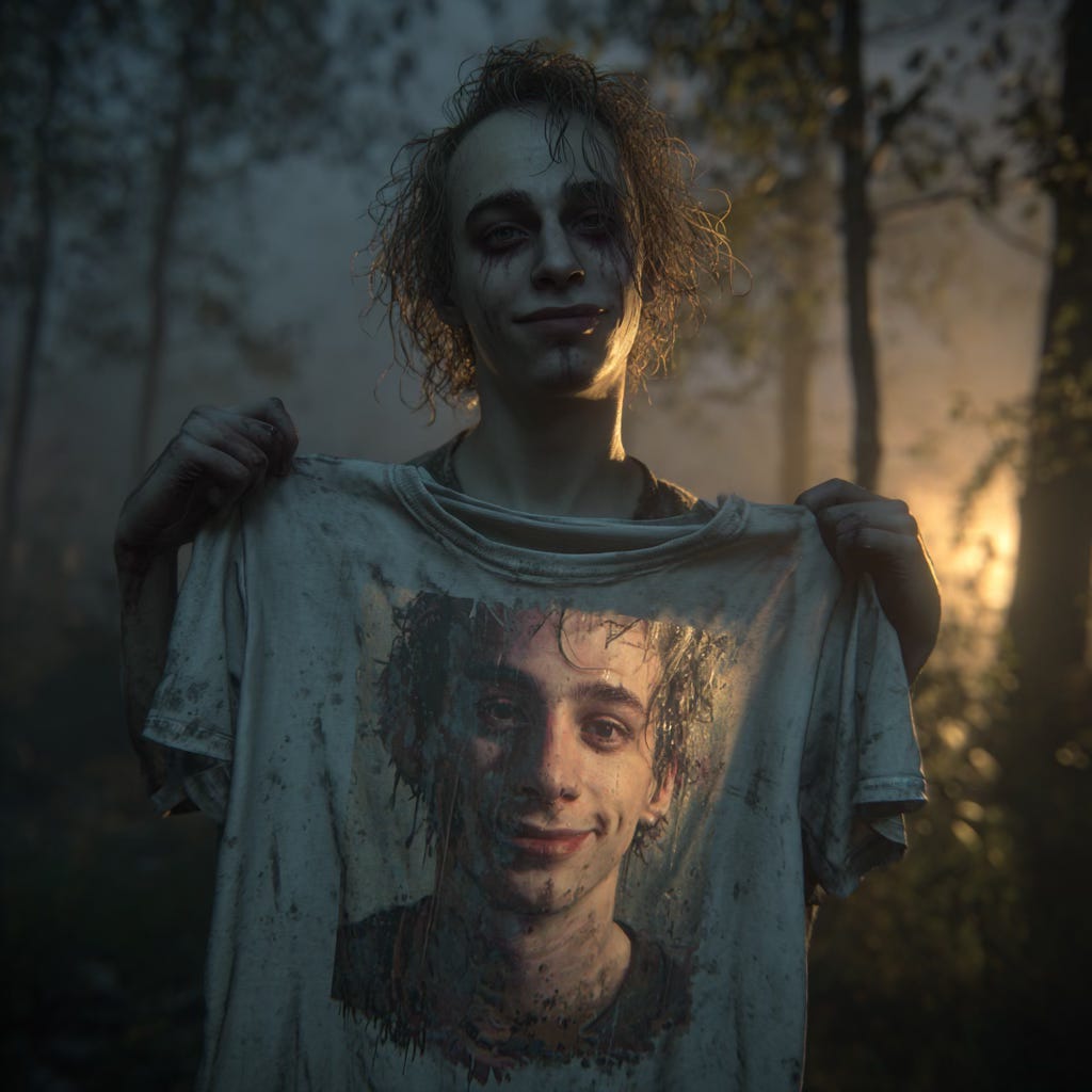 A white T-shirt with Greg’s shirtless face printed across it, the kind of memorial tee worn at funerals.